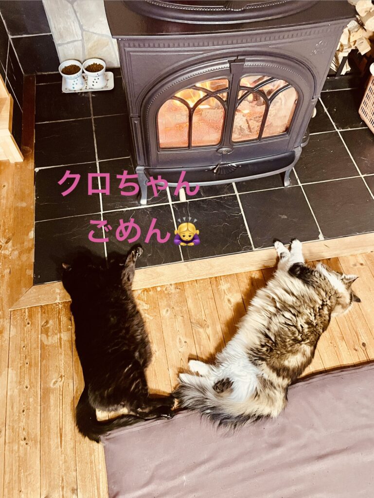 クロちゃんはヒーターの前で寝ています。