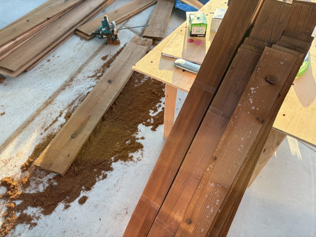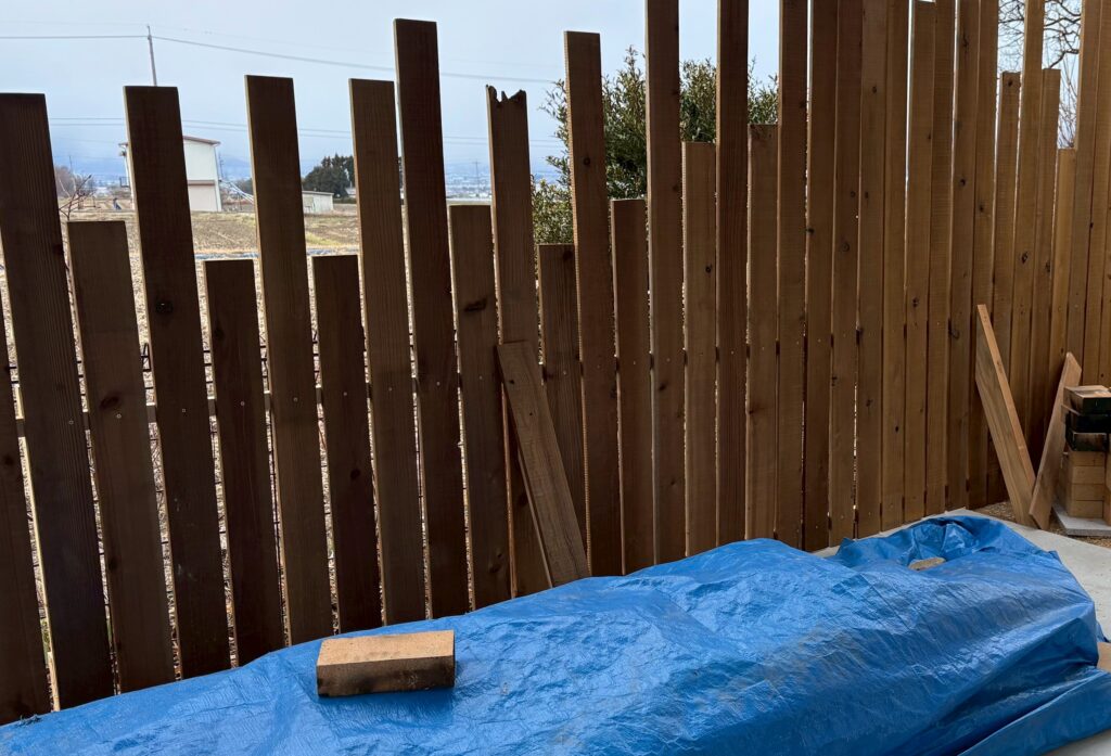 既存フェンスより少し高くしたいので杉板を半分の長さにカットし 縦に張っていきます