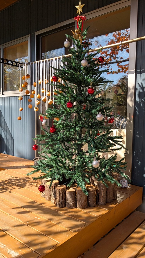 我が家のクリスマスツリーの隣には、今年も干し柿が吊るされました。