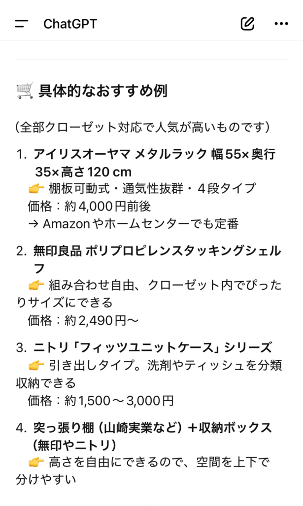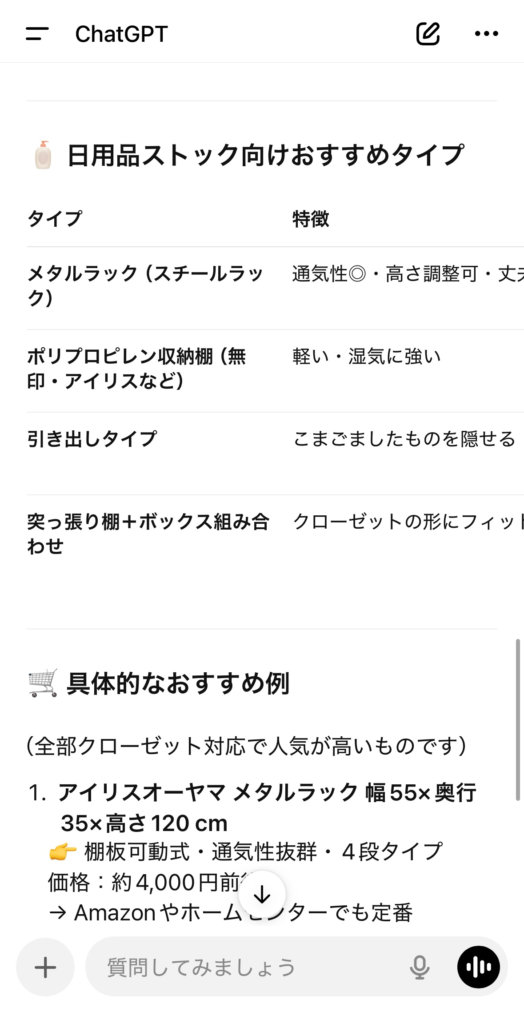 先日もクローゼットの中に日用品をストックするための棚が欲しいなと思い。 ChatGPT に聞いてみました。