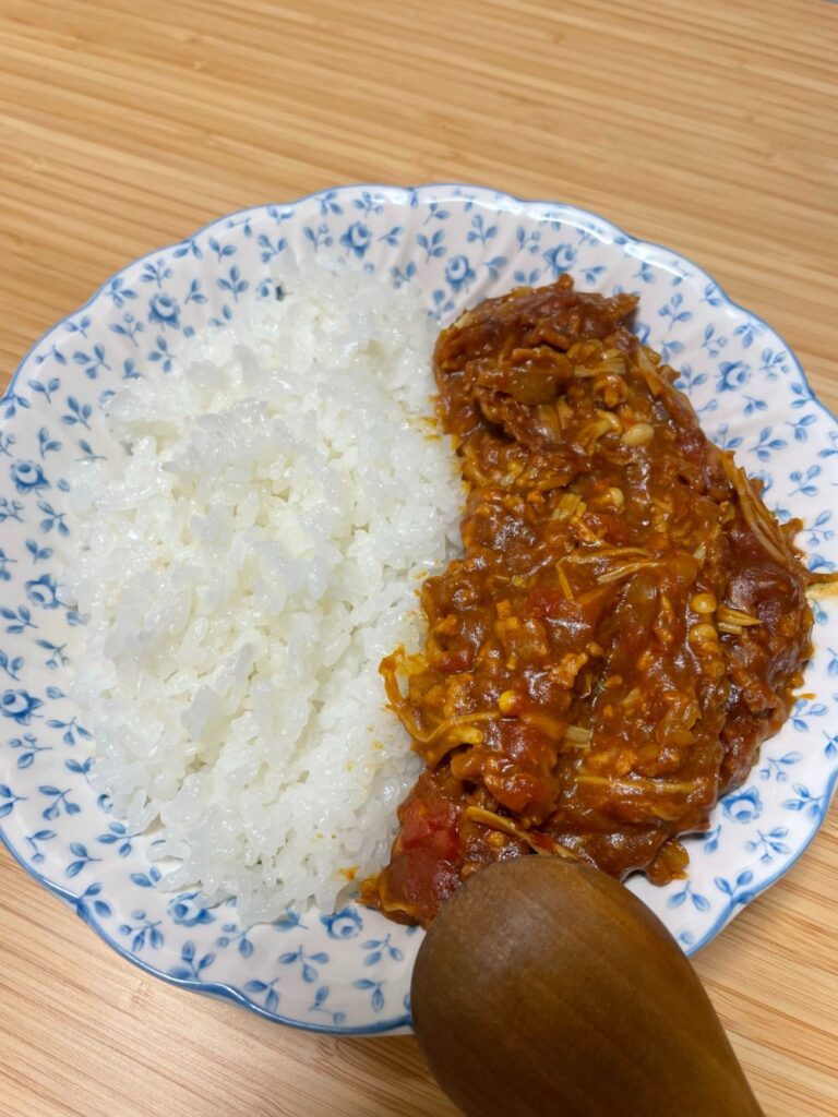 トマト缶、えのき、ひき肉、玉ねぎ、カレー粉を使って作ってみましたが、