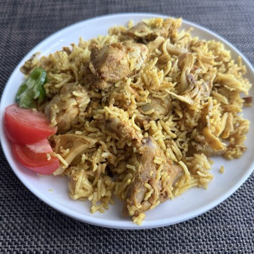 ビリヤニは、スパイスと肉(チキンやマトン)、バスマティライス(細長いお米)を炊き込んだご飯で、