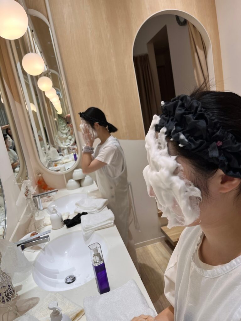 プチ講義の後は、早速、洗顔体験!もちもちの弾力泡がとっても気持ちいい!
