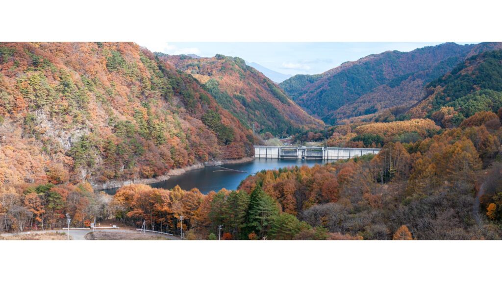 振り返ると紅葉に囲まれた内村ダムが。