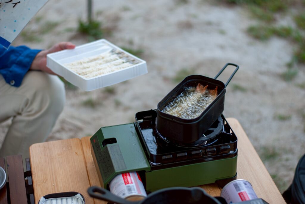 キャンプでエビフライ揚げてる意味不明な写真なのにカッコイイですよ。