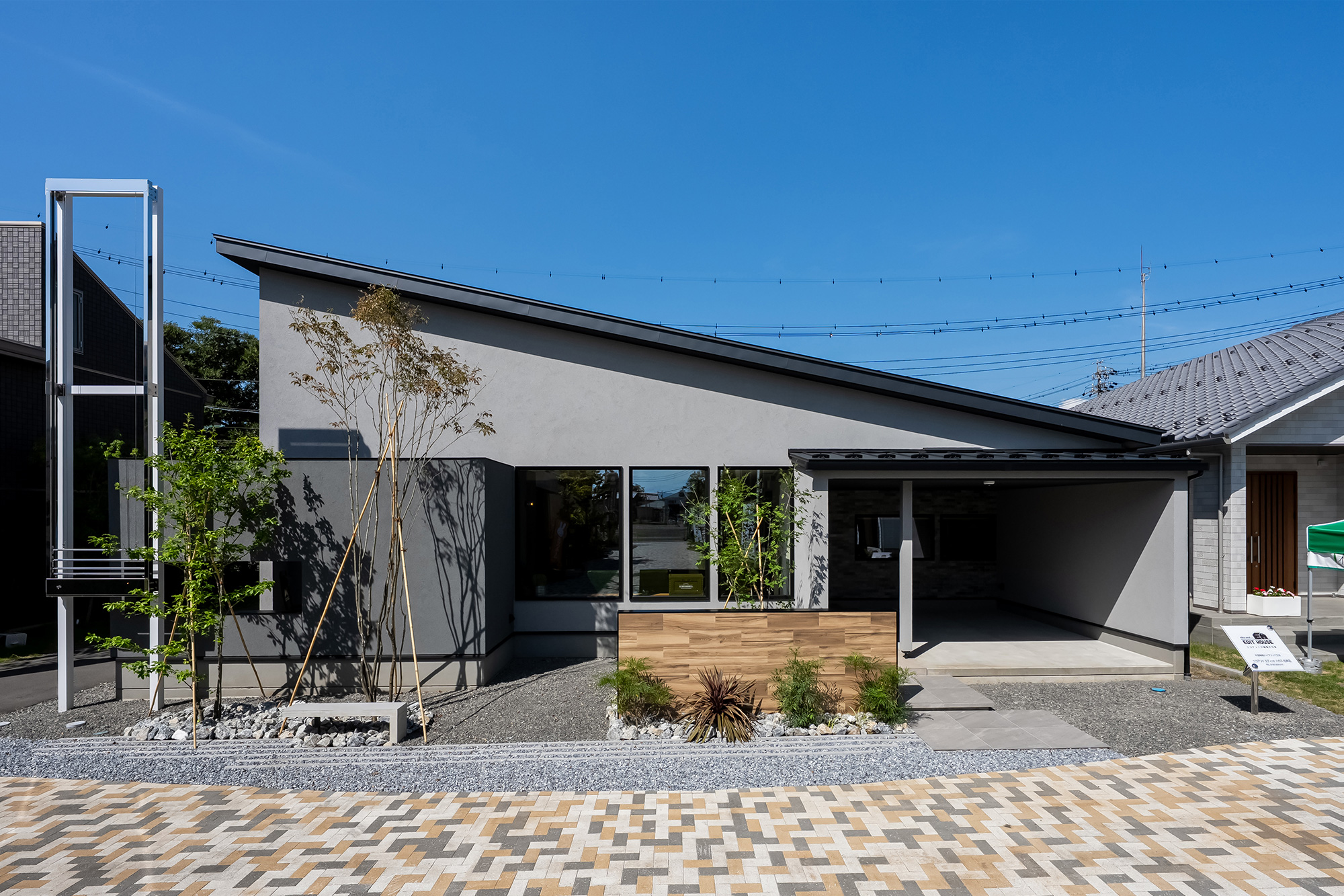 外観はグレーの塗り壁、内装は明るい木目にアイアンブラックがアクセントになる。1階で生活が完結する平屋スタイルで、デザイン性と機能性を両立。LDKは大きな吹き抜けに光と風が心地よくめぐる解放感にあふれた空間に。
